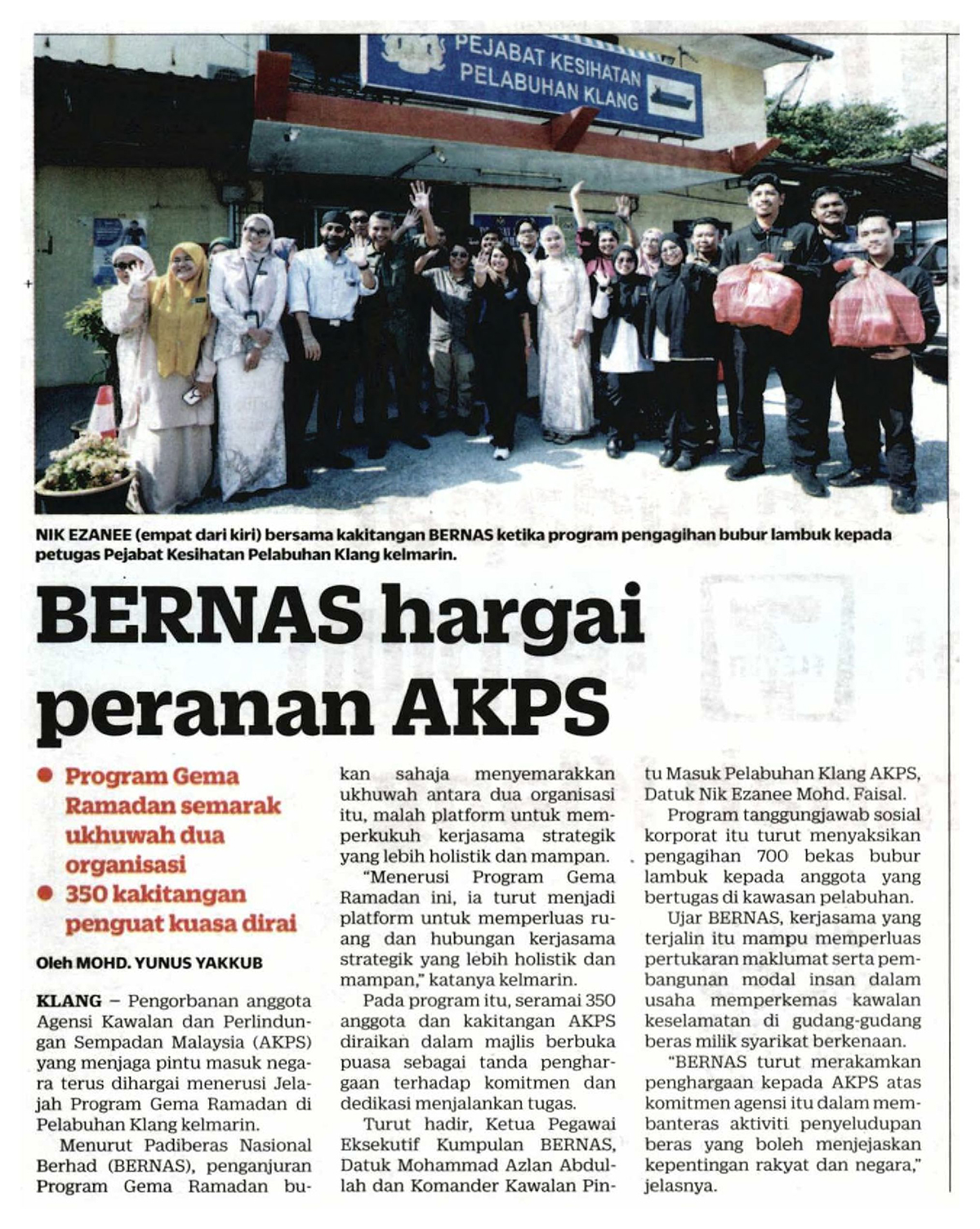 Pengorbanan anggota Agensi Kawalan dan Perlindungan Sempadan Malaysia (AKPS) yang menjaga pintu masuk negara terus dihargai menerusi Jelajah Program Gema Ramadan di Pelabuhan Klang kelmarin. Menurut Padiberas Nasional Berhad (BERNAS), penganjuran Program Gema Ramadan bukan sahaja menyemarakkan ukhuwah antara dua organisasi itu, malah platform untuk memperkukuh kerjasama strategik yang lebih holistik dan mampan.