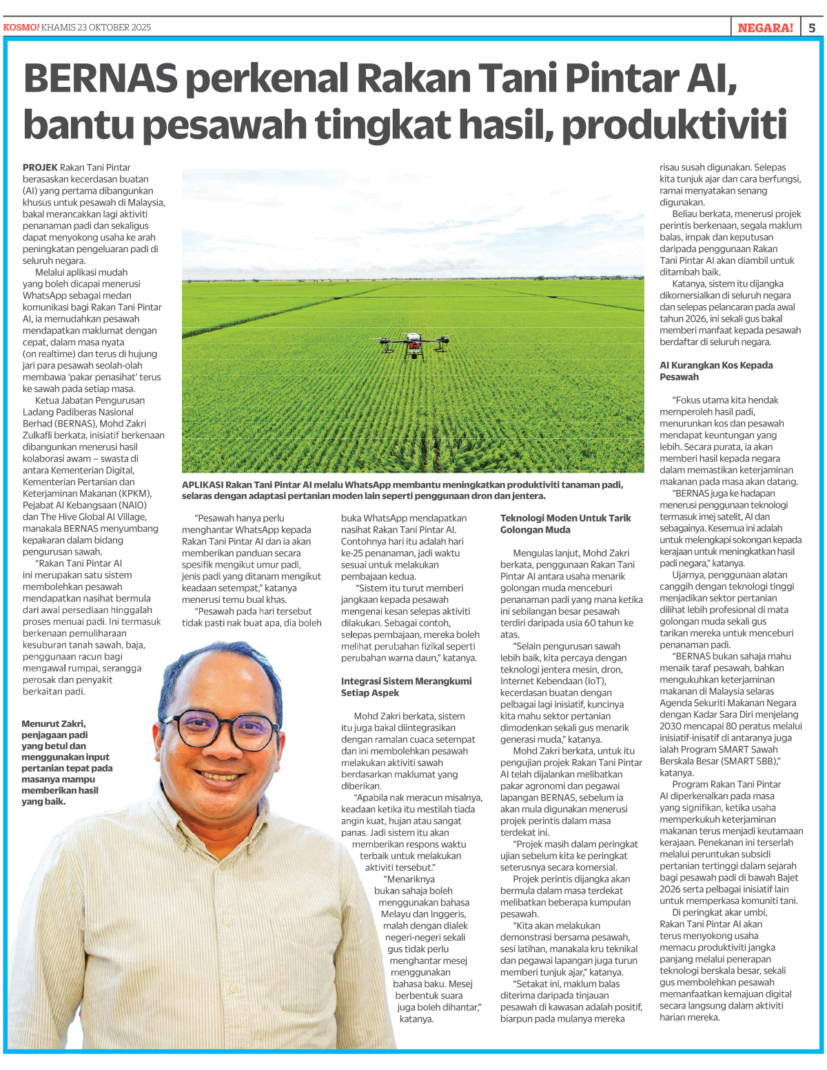 Projek Rakan Tani Pintar berasaskan kecerdasan buatan (Al) yang pertama dibangunkan khusus untuk pesawah di Malaysia, bakal merancakkan lagi aktiviti penanaman padi dan sekaligus dapat menyokong usaha ke arah peningkatan pengeluaran padi di seluruh negara.