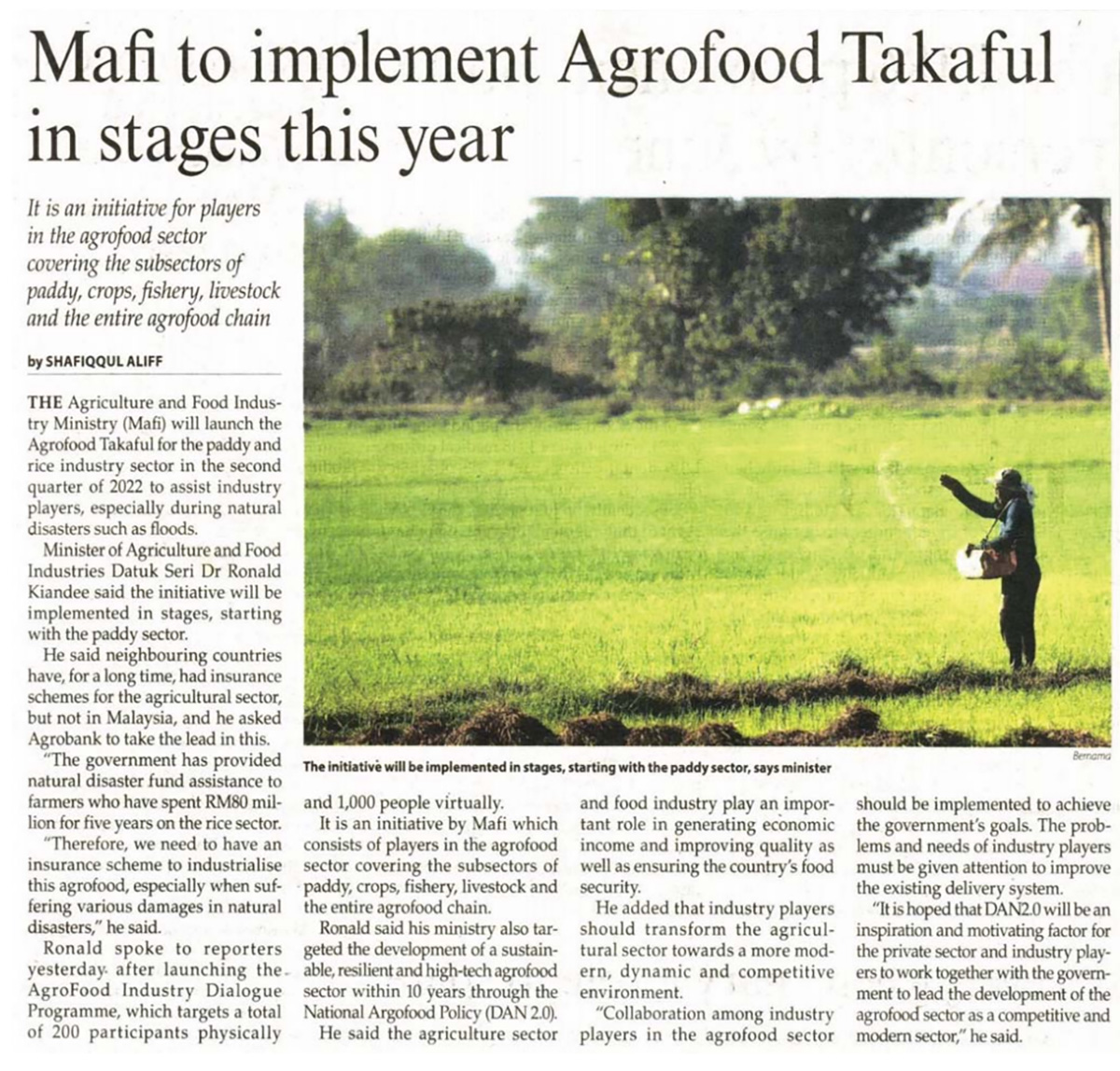 The Agriculture and Food Industry Ministry (MAFI) will launch the Agrofood Takaful for the paddy and rice industry sector in the second quarter of 2022 to assist industry players, especially during natural disasters such as floods. Minister of Agriculture and Food Industries Datuk Seri Dr Ronald Kiandee said the initiative will be implemented in stages, starting with the paddy sector.